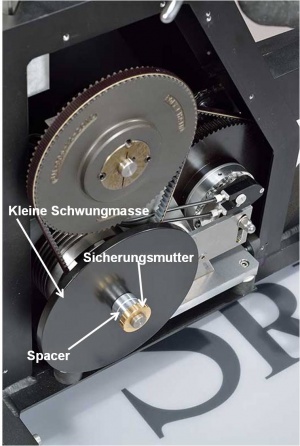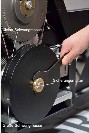 Die Schwungscheiben können nach Entfernen des linken Ergometerdeckels durch Lösen der messingfarbenen Sicherungsmutter einfach gewechselt werden. Es reicht, die Sicherungsmutter handfest anzuziehen.