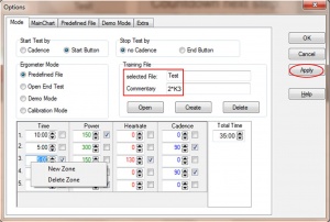- Gehen Sie nun auf den unteren Teil des Fensters und geben Sie die einzelnen Stufen ein. Klicken Sie dazu zuerst auf das Eingabefeld unter Time (Zeit) und geben Sie die Zeit ein, welche diese Stufe dauern soll. Gehen Sie anschließend rechts auf die Eingabefelder für Power (Leistung), anschließend Heartrate (Herzfrequenz) und dann Cadence (Trittfrequenz). Wenn die Zeile und damit die Trainingsstufe fertig eingetragen ist, erzeugen Sie mit der Taste Pfeil unten die nächste Zeile. Sie können auch mit dem Mauszeiger in das Feld Time gehen und die rechte Maustaste drücken und dann zwischen New Zone und Delete Zone auswählen. Mit Delete Zone löschen Sie die Zeile und mit New Zone fügen Sie eine neue Zeile oberhalb ein. Durch abhaken der Werte hinter Power, Heartrate und Cadence legen Sie fest welcher Wert während des Trainings als Vorgabe auf dem Bildschirm erscheint. Es ist immer nur möglich, einen Wert abzuhaken und als Vorgabe auf dem Bildschirm zu sehen (der Haken hinter der Zeit ist immer möglich und bedeutet das Setzen einer Markierung). Rechts unter Total Time sehen Sie die Gesamtzeit des Tests. Klicken Sie auf Apply um den Test zu speichern.